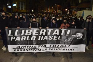 Los manifestantes que han participado en la manifestación contra el encarcelamiento del rapero Pablo Hasél han llegado al perímetro de la prisión de Lleida, en la que está el cantante desde este martes.